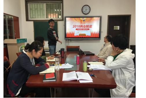 会上,支部全体党员按主题党日规定流程重温入党誓词、诵读党章,并现场缴纳党费。接着,杨国强老师以《奋进新时代 筑梦新征程——2018“两会”精神解读》为题,分五个部分:“两会”基本概述、2018“两会”七大看点、两个焦点、对2018年政府工作的建议及如何做为全体党员做了深入浅出的解读。其中,着重就“宪法修改”和“机构改革”两大焦点问题进行了分析,指出,将党的领导新增进宪法,是深入贯彻落实十九大精神的突出表现;深化党和国家机构改革是新时代提出的新任务和新要求。