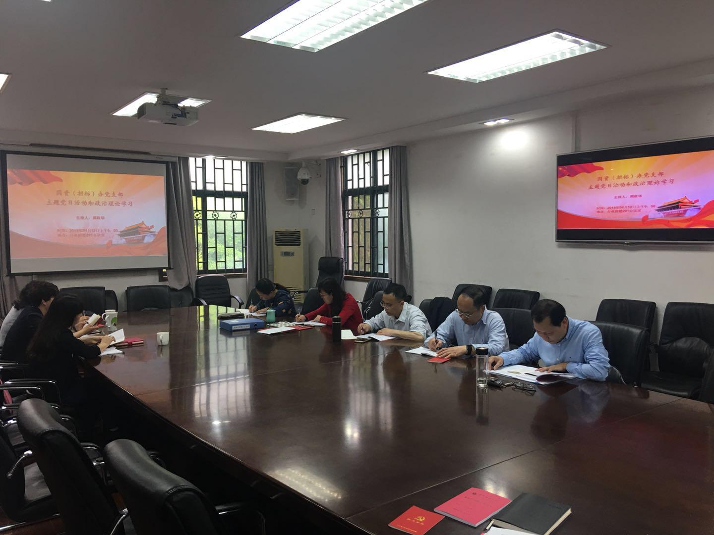 2018年4月12日上午9点,国资招标办党支部在行政楼附楼201会议室组织全体党员专题学习2018年全国“两会”精神,支部书记周政华主持会议。