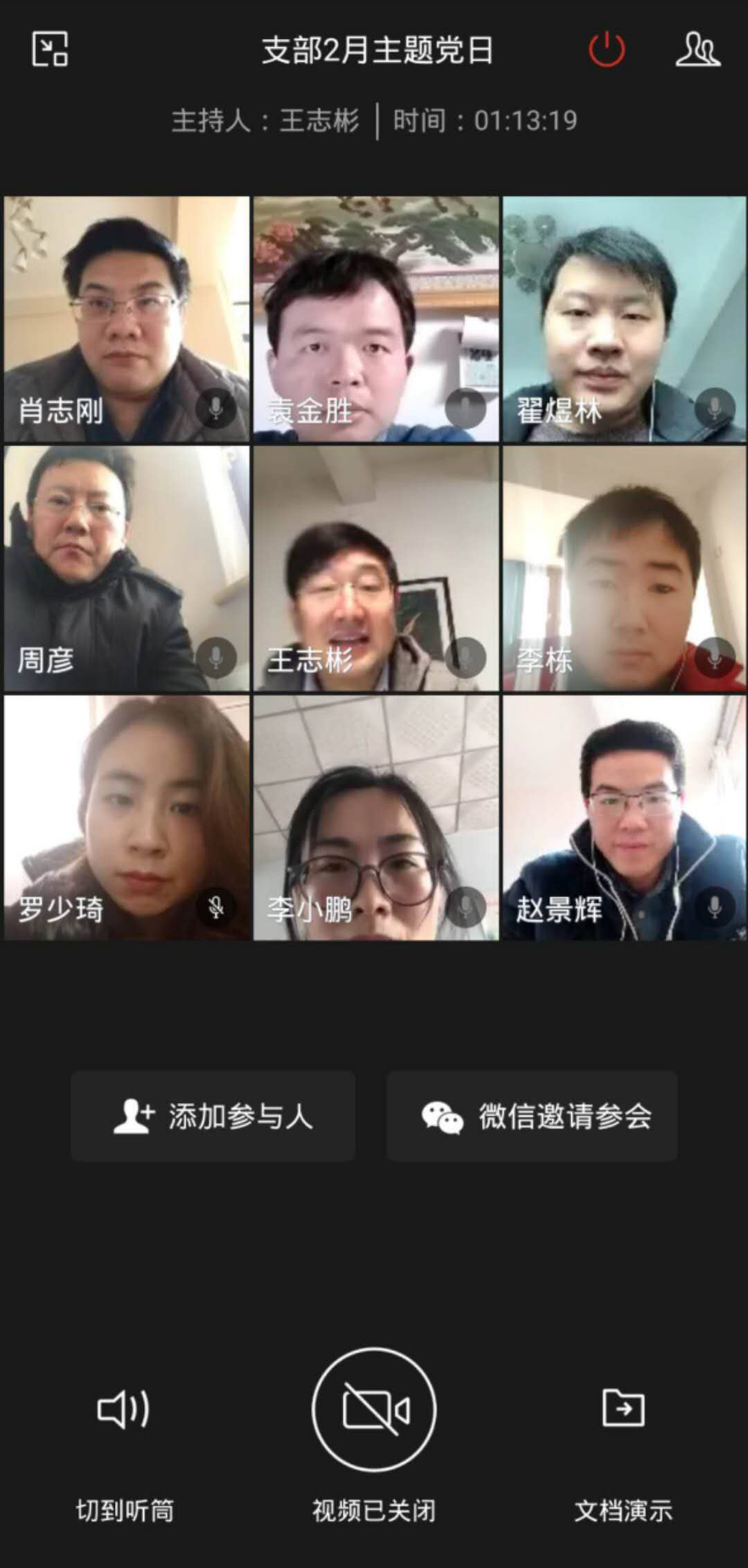 2月24日,因疫情而无法在线下聚在一起的合作办支部全体成员召开了一场特殊的主题党日活动,地点从往日会议室转战到企业微信视频会议上,并利用微信群同步推送学习内容,支部全体成员参加,党外群众列席,支部书记王志彬主持会议。