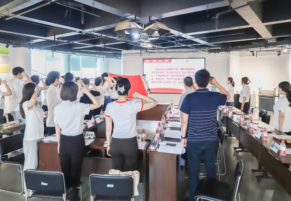 全体党员面向党旗重温入党誓词。“艺心向党”学生党支部书记张爱与美术学院团委书记汤益迦分别领学习近平总书记考察中国人民大学时的重要讲话精神和习近平总书记在庆祝中国共产主义青年团成立100周年大会上的重要讲话精神。