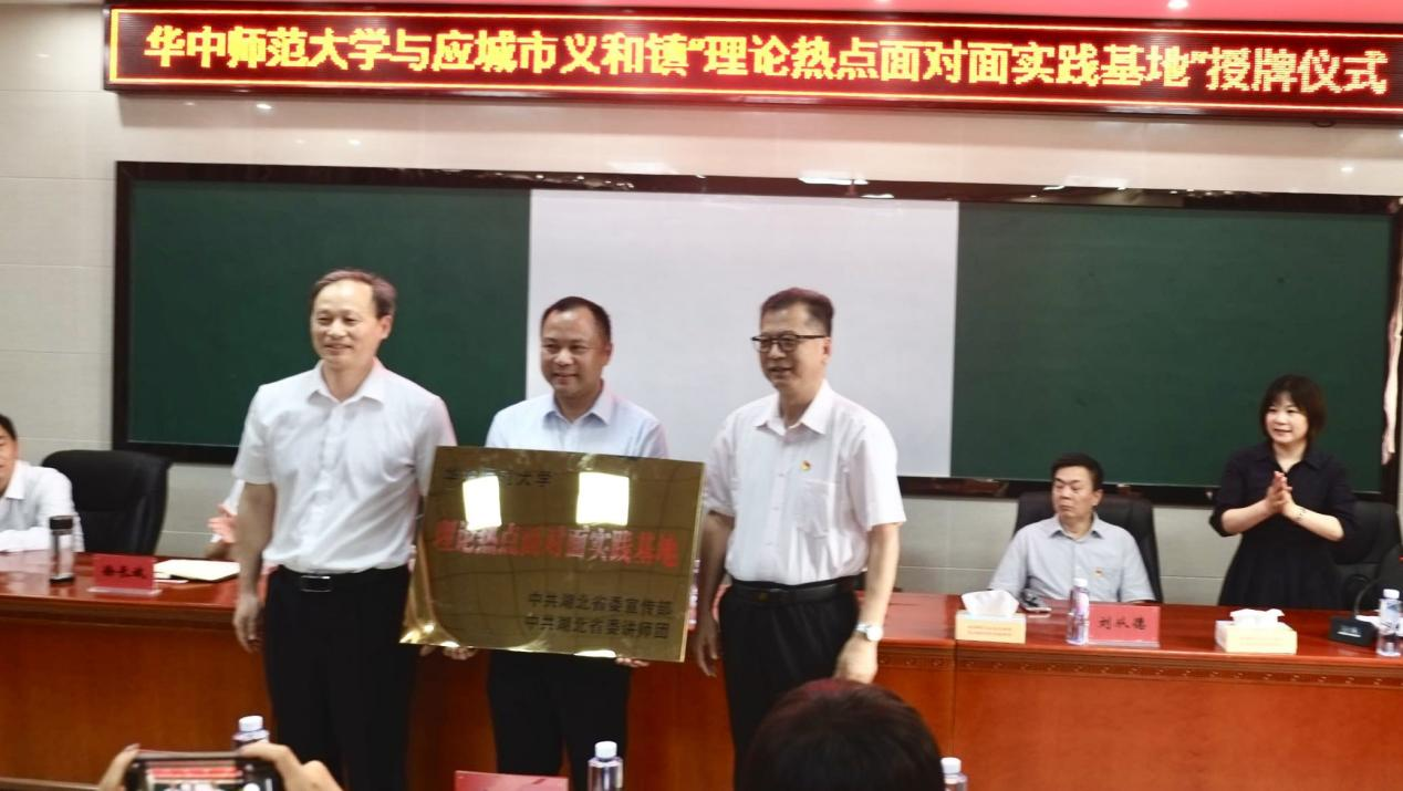 (通讯员 卞亚琴 胡尉尉 宋玉麒) 6月10日,社科处党支部与历史文化学院党委中心组成员、近代史所党支部全体党员一行29人,赴应城市义和镇进行华中师范大学“理论热点面对面实践基地”授牌仪式,湖北省委讲师团主任高天琼,副校长彭南生,应城市委书记徐长斌,孝感市委宣传部副部长胡光辉,应城市委常委、宣传部长李艳霞出席授牌仪式。