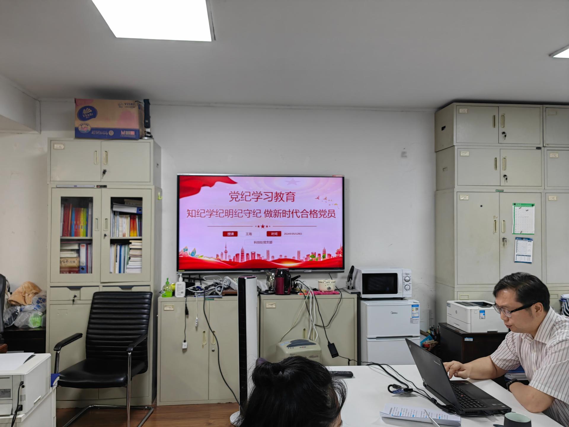 (通讯员 杨备)5月29日下午,科技处党支部在行政楼209室开展党纪学习教育活动,活动由支部书记王海同志主持,支部全体在职党员参会。