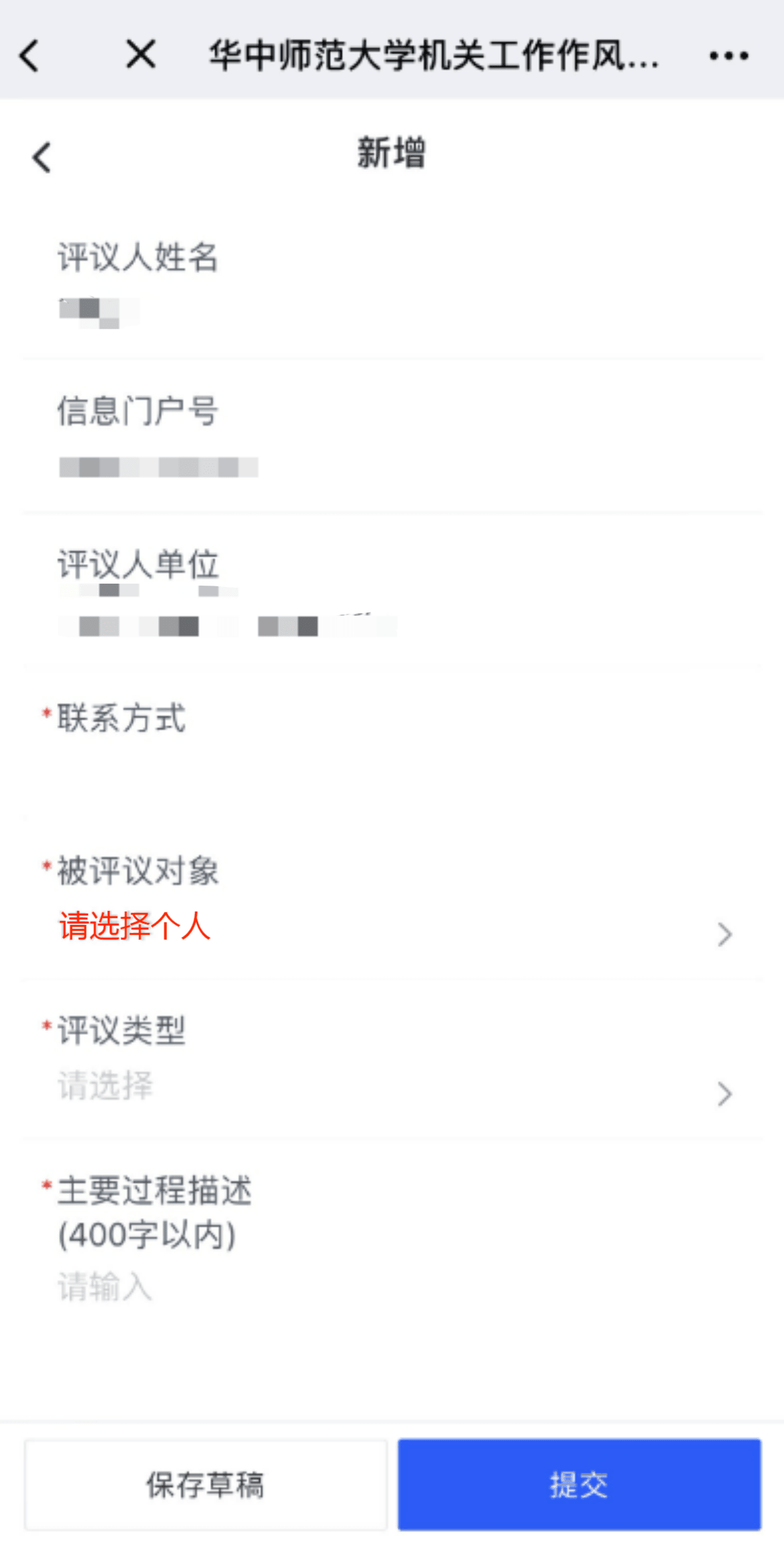 评议个人:在新增界面选择“被评议对象”为“个人”。