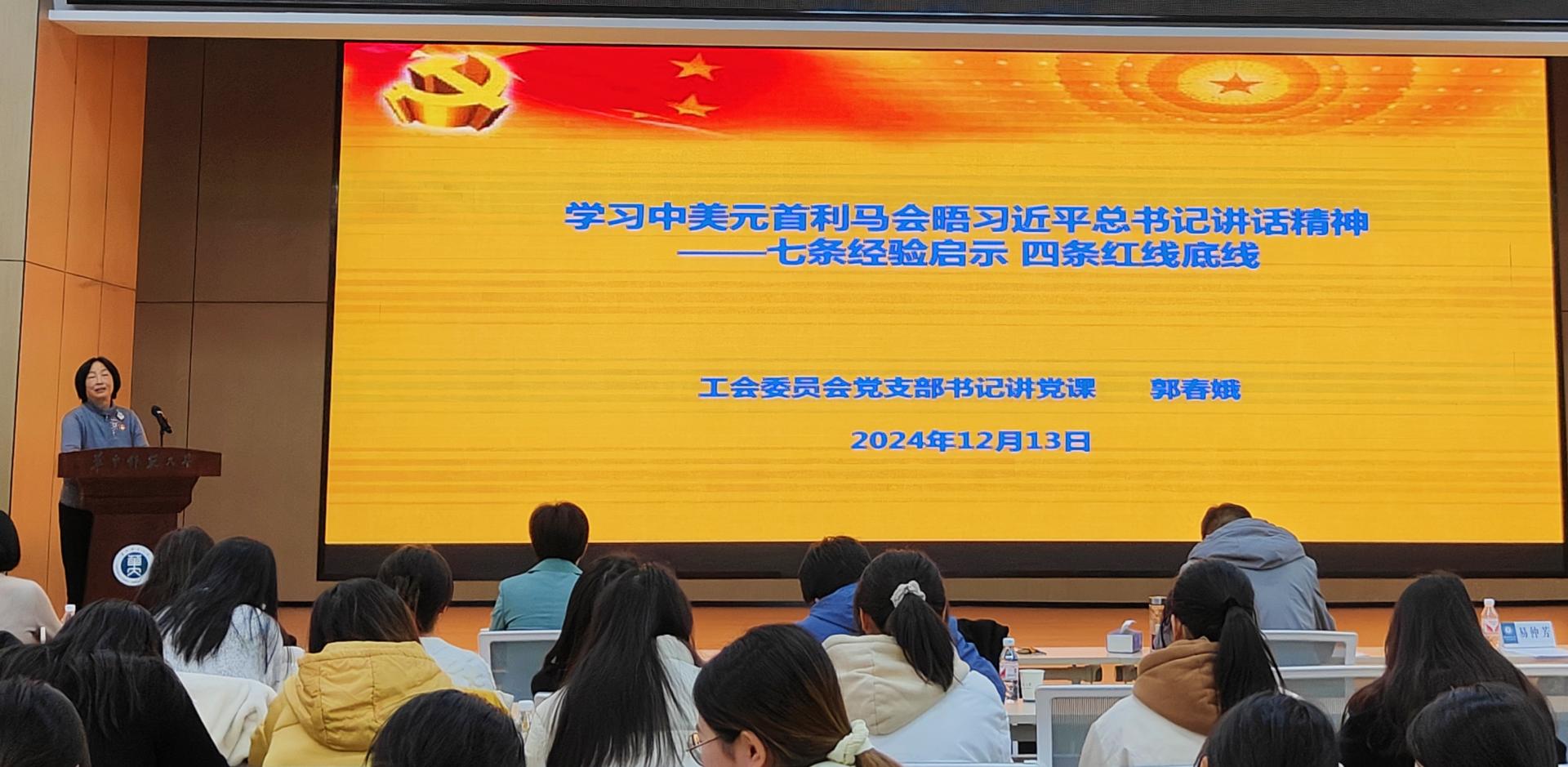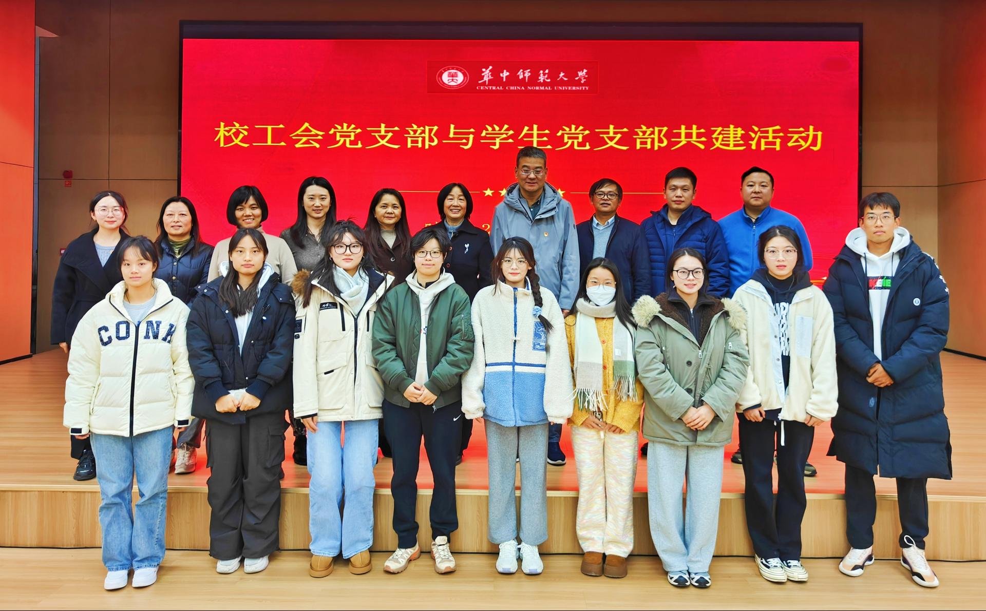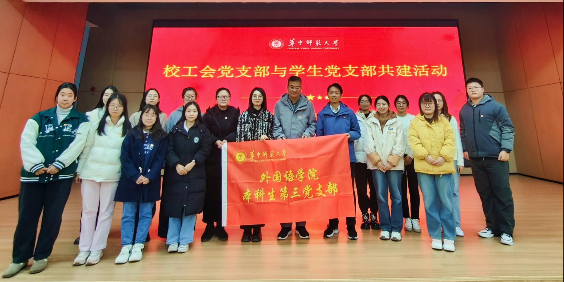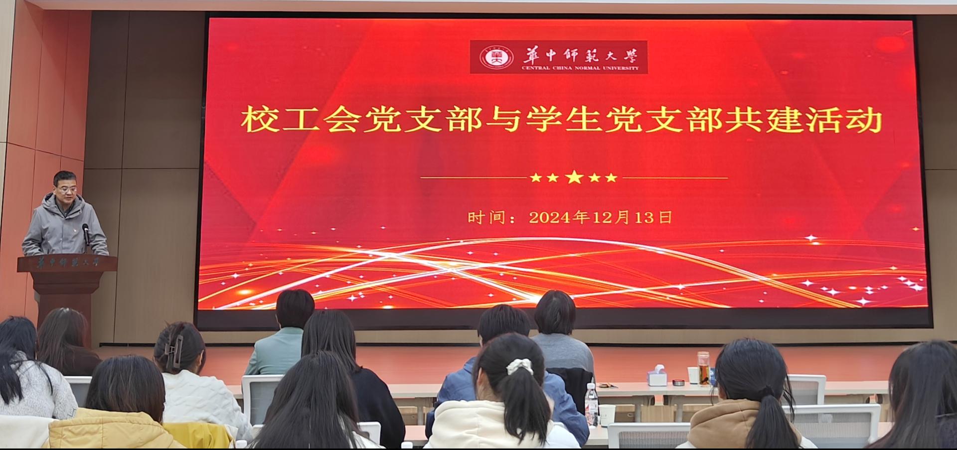 (通讯员 左焦杰)12月13日下午,根据学校《关于进一步做好机关党支部与院系党支部结对共建》以及《持续推进党员领导干部联系党支部工作》等文件的指示精神,校工会党支部与外国语学院小语种本科生党支部、体育学院鲲鹏班学生党支部、美术学院2023级研究生党支部、社会学院2402班本科生党支部在老年活动中心五楼联合举办了一场内容丰富、意义深远的共建活动。校工会主席骆军,校工会党支部书记郭春娥,马克思主义学院教授、校团委兼职副书记薛惠,校工会副主席易仲芳,外国语学院党委副书记陈哲参与此次共建活动。本次活动旨在通过专题讲座和专题党课等形式,加强党员之间的交流与学习,进而实现“以共建促党建,以共建促了解,以共建促合作,以共建促发展”的目标。