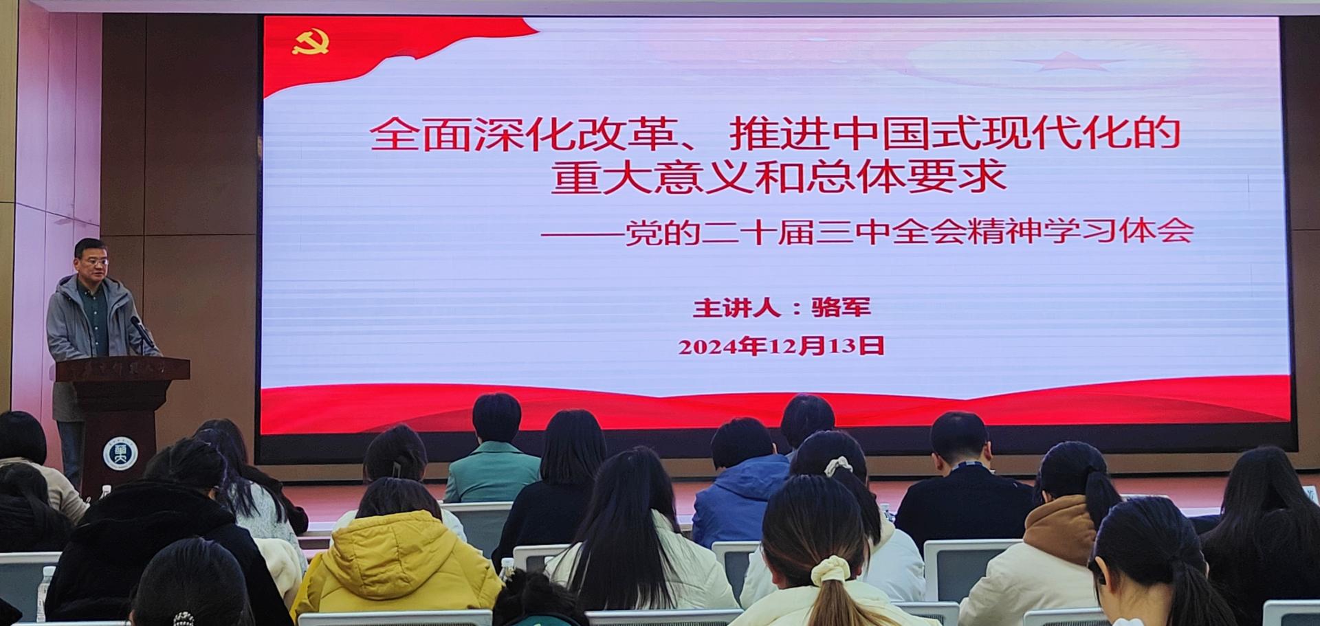 随后,活动进入专题党课环节。骆军以“全面深化改革、推进中国式现代化的重大意义和总体要求——党的二十届三中全会精神学习体会”为主题,为党员们上了一堂生动的党课,他详细阐述了什么是中央全会,党的二十届三中全会会议概况,“七个聚焦”“六个坚持”等内容。讲解深入浅出,让党员们对党的二十届三中全会精神有了更为深刻的学习领悟。
